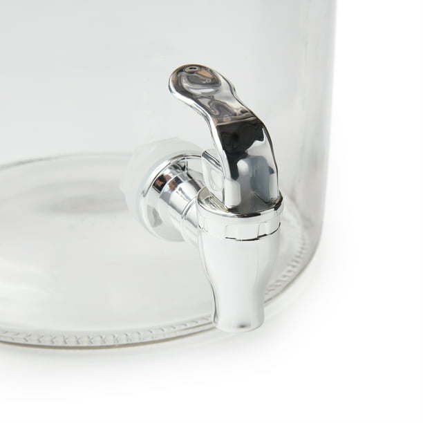 The Better Homes & Gardens 1.5 Gallon Glass Beverage Dispenser with Wood Lid. Designed with clear glass to allow contents and amounts to be readily identified, this lovely beverage dispenser features a sturdy steel handle that makes transporting and cleaning easy. Topped with a solid wood lid with a gray finish that is both decorative and functional, the dispenser has a reliable plastic spigot that keeps liquids contained until it's time to pour. Perfect for parties, family meals, or just resting on your counter to keep a ready supply of water, iced tea, lemonade, or another of your favorite beverages available, the Better Homes & Gardens 1.5 Gallon Glass Beverage Dispenser with Wood Lid is a hand-wash only.
