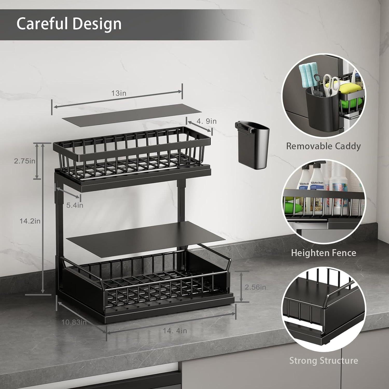 1.A Double Delight: This 2-tier under sink organizer is designed to take full advantage of the vertical space under your sink. With two sliding drawers, you have double the storage for all your essentials, from cleaning supplies to toiletries.